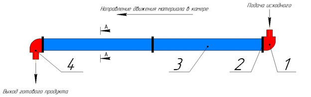 Материал подается из питателя-дозатора в входной патрубок 1, и самотеком проходит через помольные камеры, в которых происходит измельчение продукта. Готовый продукт выходит через выходной патрубок.